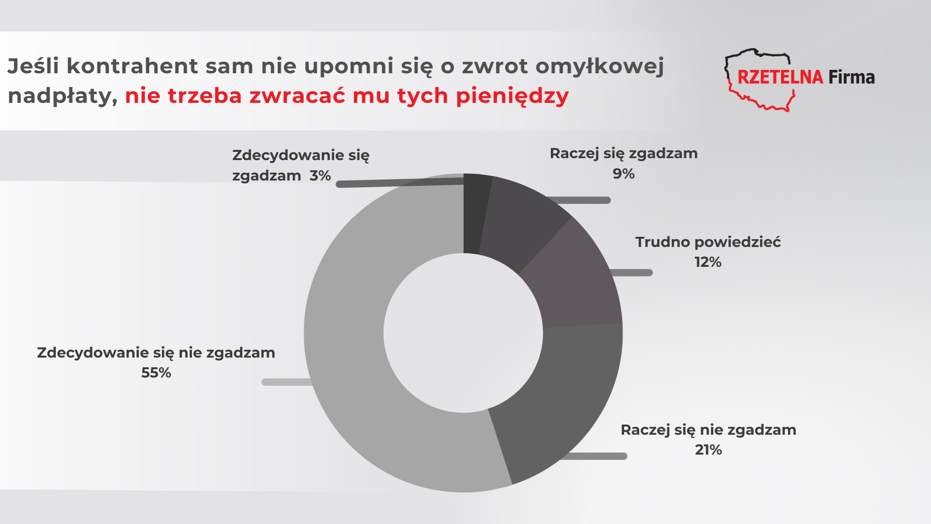 Jedną z takich zasad jest na przykład zwrot omyłkowej nadpłaty. Jeśli kontrahent sam nie upomni się o pieniądze, 76 proc. ankietowanych w badaniu Rzetelnej Firmy deklaruje, że odda nadwyżkę. Uważa tak 77 proc. mikrofirm, 67 proc. małych i 74 proc. średnich firm. W podziale na branże znów najwięcej, bo 87 proc. takich „uczciwych” wskazań płynie od firm usługowych. Z kolei na przeciwległym biegunie znajduje się 12 proc. przedsiębiorców, którzy nie zgadzają się ze stwierdzeniem, że taką nadwyżkę należy zwrócić, jeśli kontrahent sam się o to nie upomina.